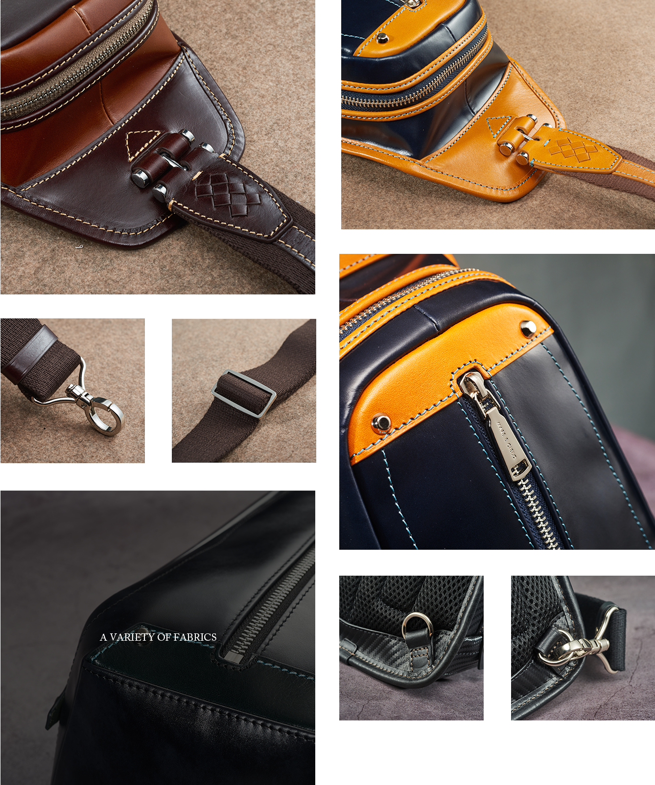 This model is a leather chest bag; production concept: simple and stylish, convenient and compact; process steps: cutting, oiling, table work, weaving shoulder straps, inner bag reinforcement, glue bonding, turning, quality inspection, packaging, and shipping ; Material: Imported leather material